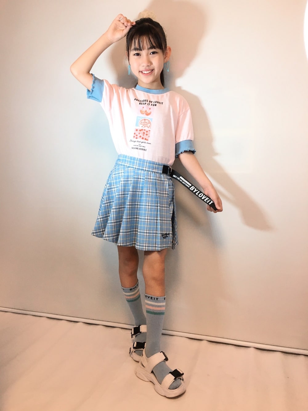爽やかブルー✖️ピンクコーデ💖 袖口と首回りがリブになっていて、ガーリーさが増すオシャレなトップスとチェックスカパンとの組み合わせです🎵