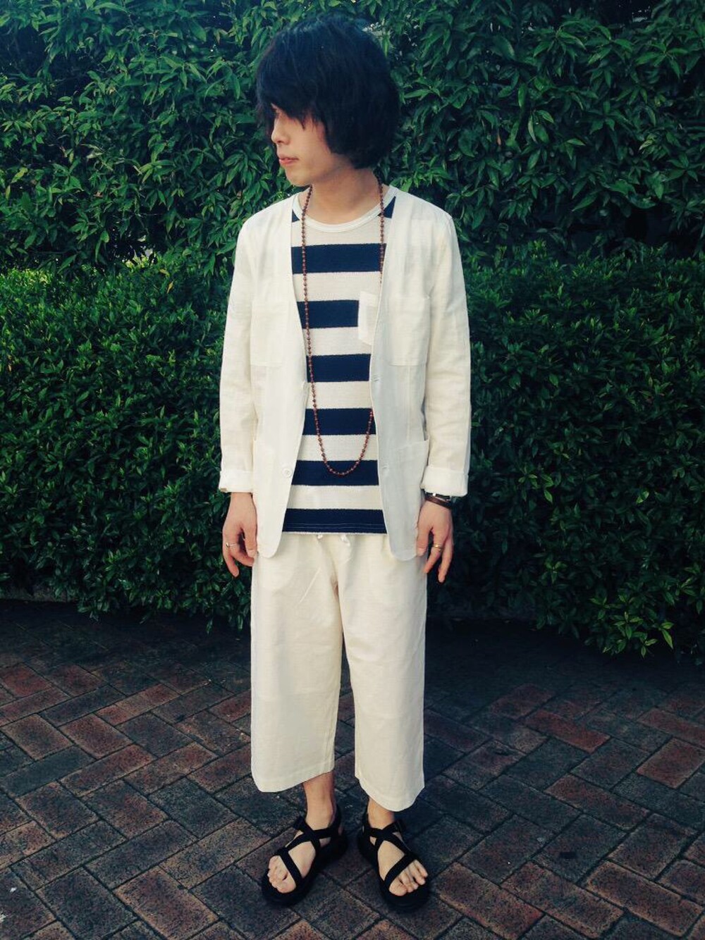 夏場のゆるラフセットアップ。 今年らしくノーカラーのJKTを。 オフホワイトのJKT、オフホワイトのPTと ボーダーteeで爽やかかつかっこいいを。