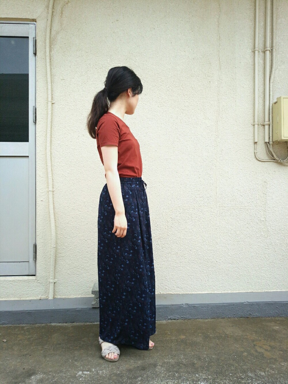 テラコッタ色を使うと楽ちんコーデもいい感じに仕上がる