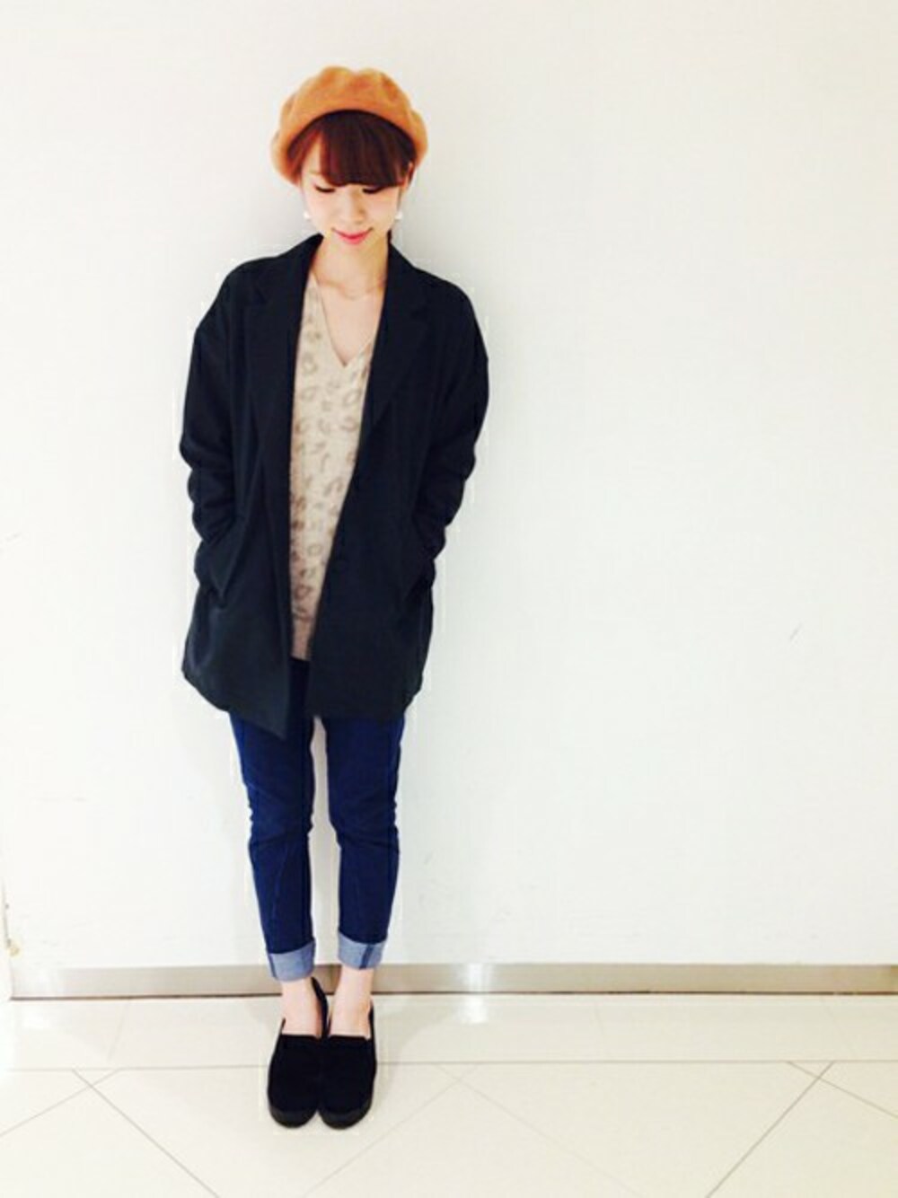 今季、大注目のチェスターコート♪どの色もキレイで迷います。。中に着ているヒョウ柄ニットがちらり。