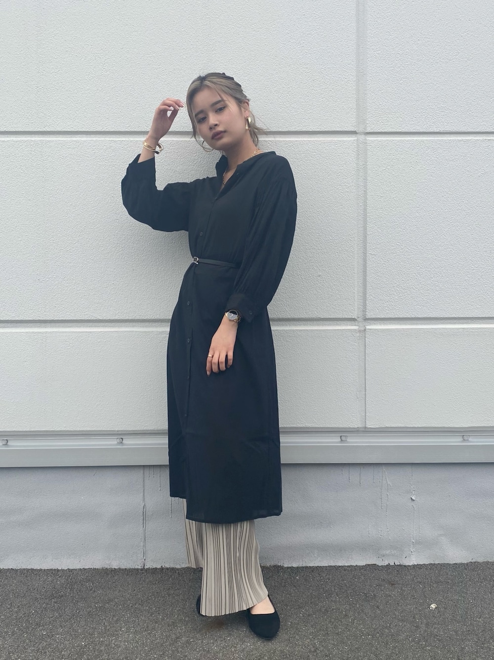 体型隠しにもできるコーディネート👆✨ ウエストにベルトを巻くだけでウエストが細く見えて、スタイルが良く見えます! そして細めのプリーツパンツや、デニムを履くだけでより細くみえる効果があります😘