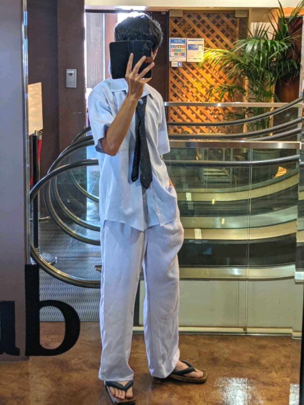 ご覧いただきありがとうございます 淡いカラーで夏らしく合わせてみました(ちょっと微妙な組み合わせ だったかも?) サンダルがないので下駄をサンダル代わりに履いています😌 首元を閉めると暑いのでネクタイを緩めにつけてアクセントにしています