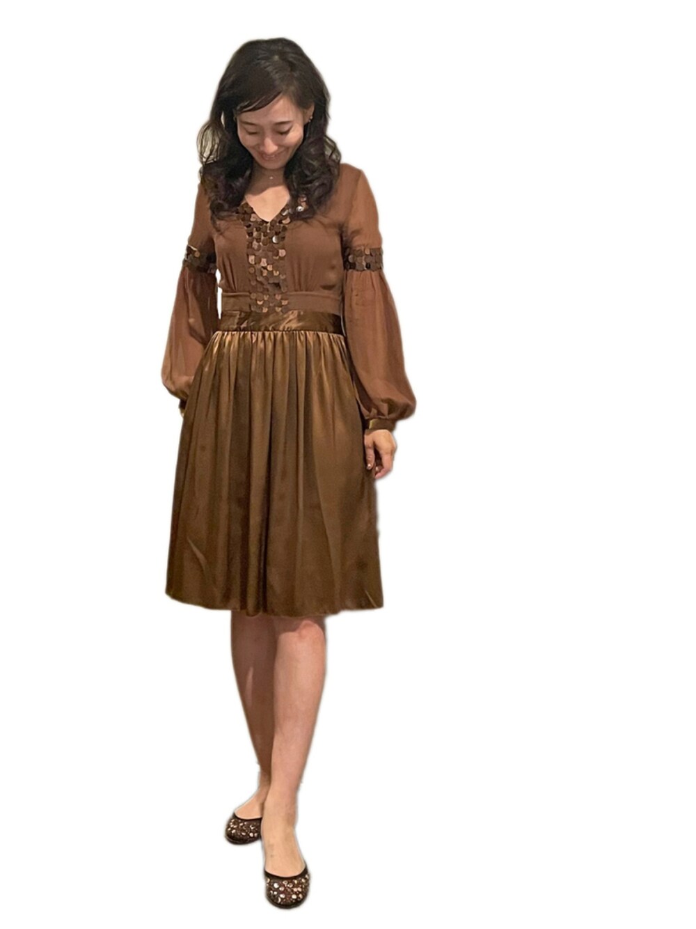 秋めいてきたのでブラウンコーデ✨ 胸元とお袖にキラキラスパンコールが素敵なシルクワンピース。 サテン生地とシフォン生地のコンビネーションで立体感が出て高級感が増し増し⤴️ アラフォー以上にはシルク100%が似合います。コレがポリエステル製だったら、安っぽくて😅❌ 程よい透け感も大人女性におススメ❤️ ブラウンの✨スパンコール靴をたまたま持ってたのでピッタリ❣️ ペタンコなのもカジュアルダウン出来てちょうど良かった‼️ #ブラウンコーデ #シルクワンピース #秋めいてきました #秋服コーデ #アラフォーコーデ #アラフォーファッション #大人可愛いコーデ #キレイめワンピース