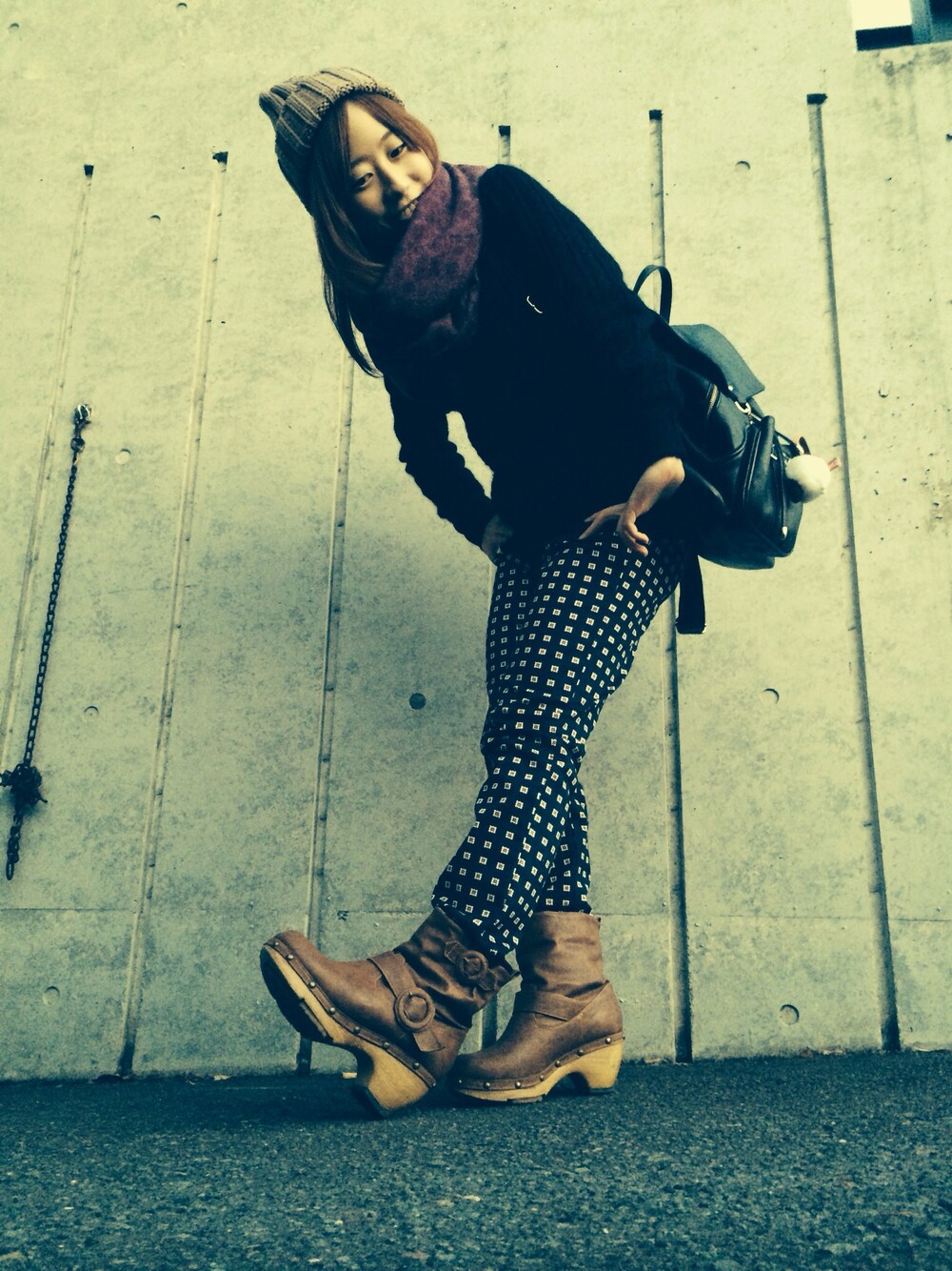 休日STYLE ニットトップス K.T kiyoko takase パンツ GAP ブーツ コキュ マフラー GAP リュック パラビオン