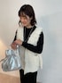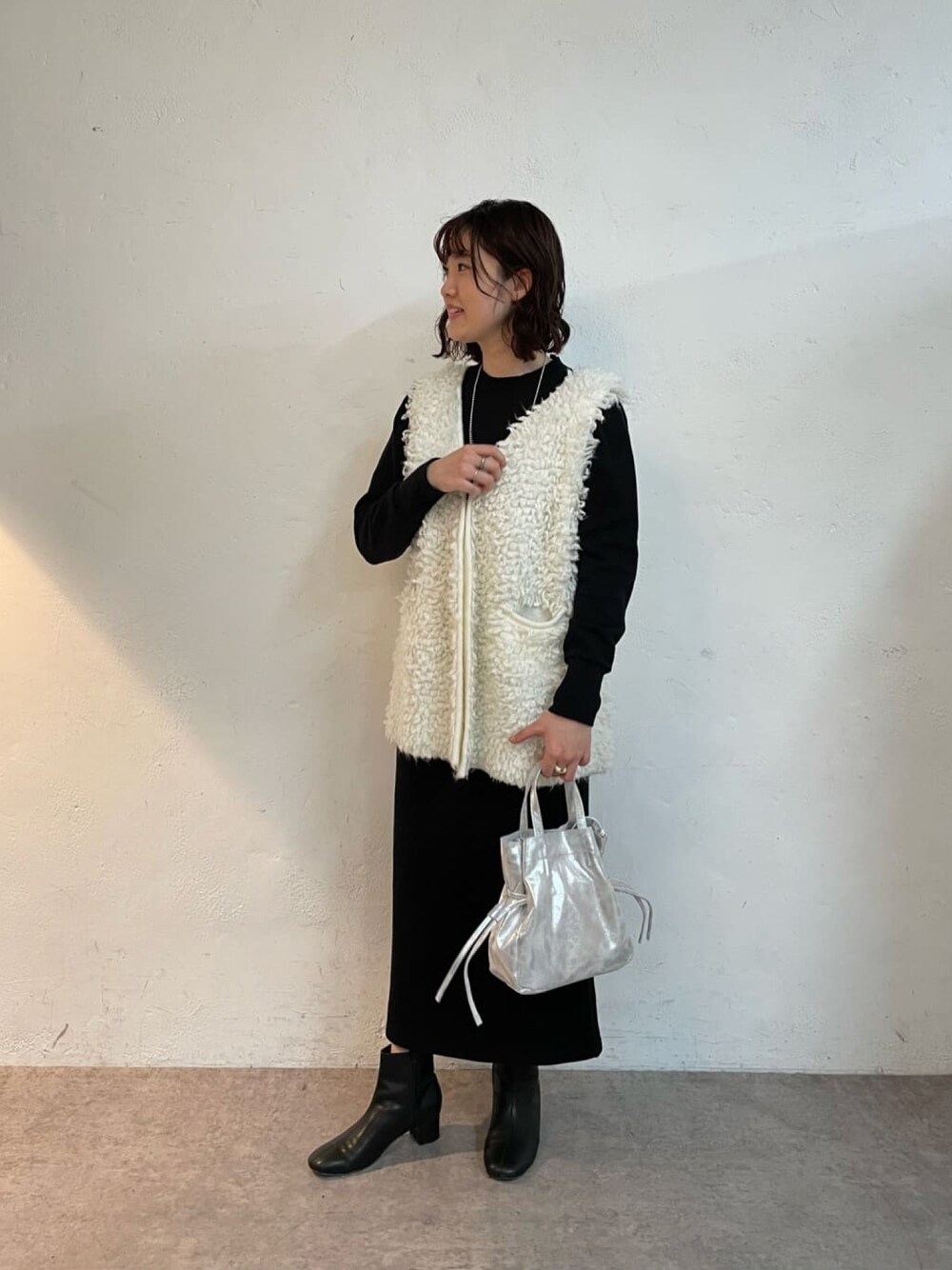 冬のモノトーンコーデ◎ ループヤーンのベストは柔らかくて着るだけでトレンド感を出せます! ワンピースはタイトなシルエットでも裏毛素材なので着やすいです。