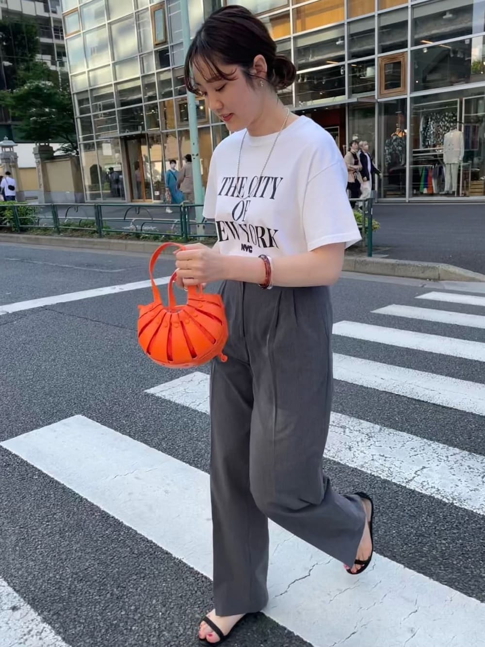 オレンジバッグがポイントの大人カジュアルコーディネート。 【トップス】 プリントが今季らしいNYC tee。 何枚あっても出番が多いTシャツは暑くなるこれからの季節におすすめのアイテムです! 【パンツ】 ハイウエストのタックパンツ。 シルエットが綺麗で、タックインもしやすいハイウエスト仕様です。 【バッグ】 カラー展開豊富なデザインバッグ。 WEB限定でブルーとピンクもございます! どれもポイントにぴったりですが、今回はシンプルなコーディネートにオレンジをチョイスしてバッグが主役のコーディネートにしました! instagram ▷ @komorin_