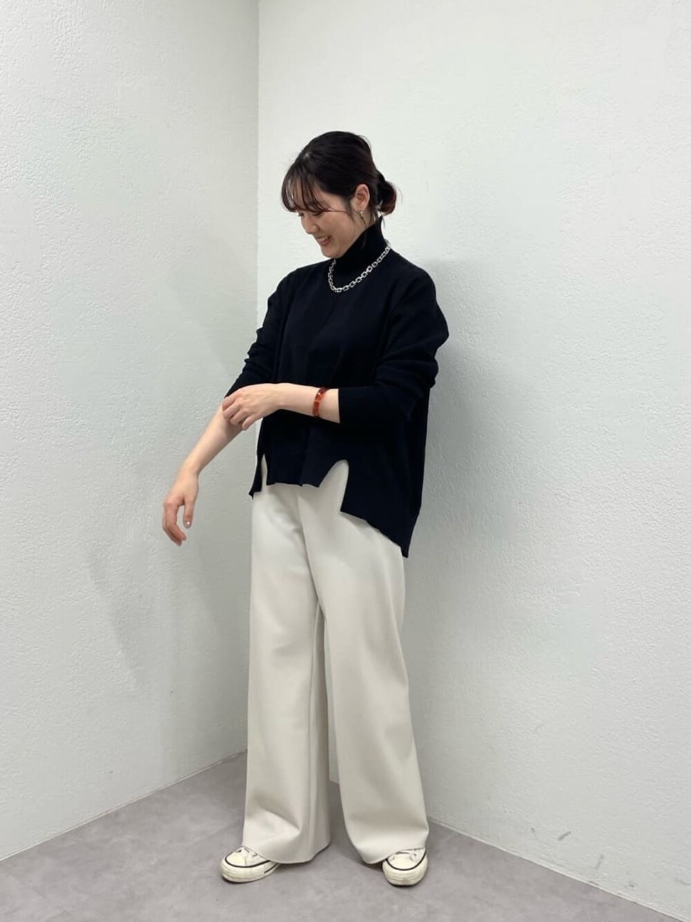 大人のシンプルカジュアルスタイリング♩ 【ニット】 ハイネックの総針ニットは非ウールなので、毛玉にもなりづらく、春まで長く着れます◎ 裾のスリットもポイントに! 【パンツ】 リアルバイのダブルクロスワイドパンツ。 イージーなのに綺麗見えする優秀アイテムです! ブーツで合わせても綺麗に履けます。 instagram ▷ @komorin_