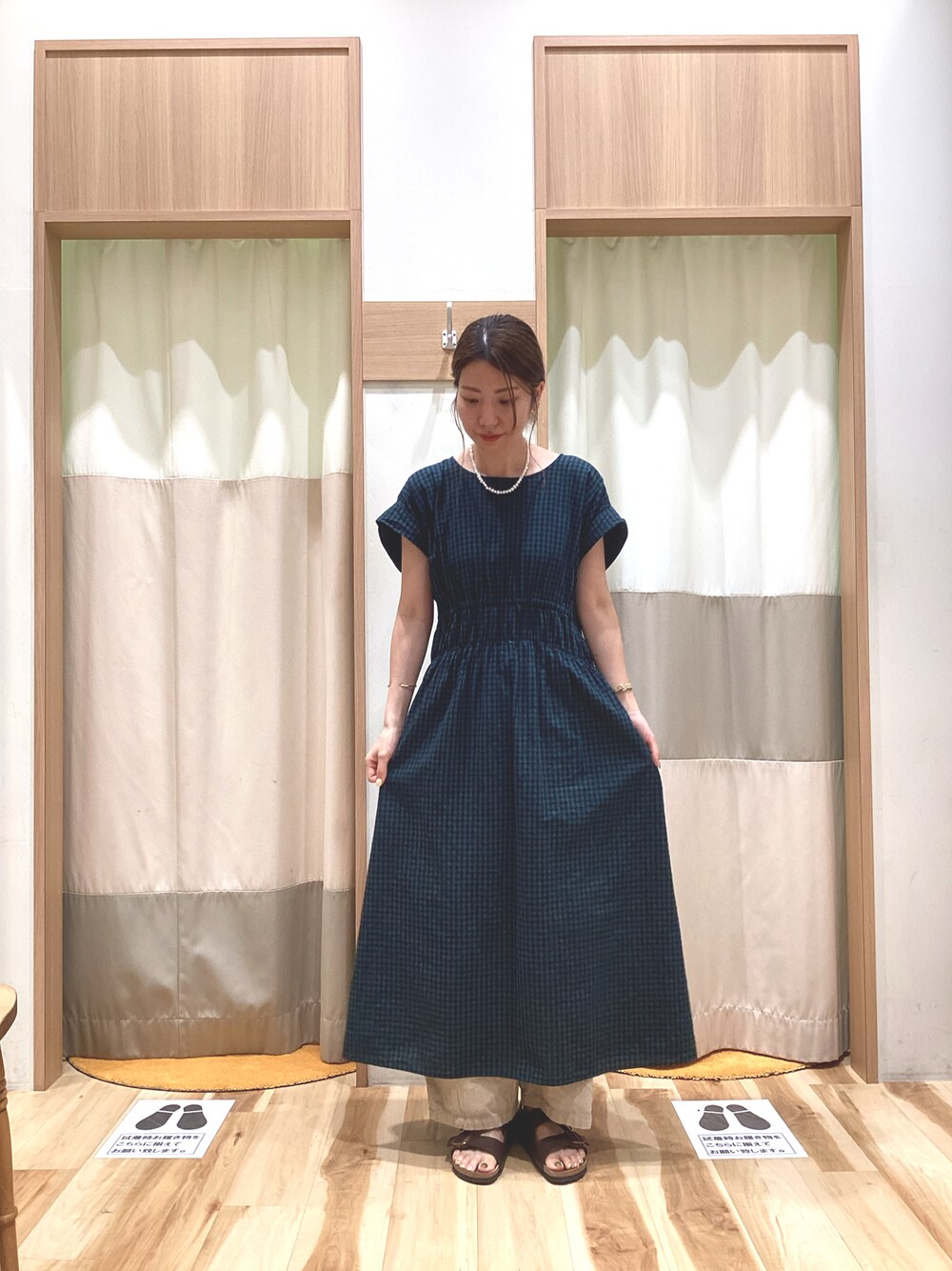 m.のワンピース「前後着シャーリングワンピース」を使ったコーディネート