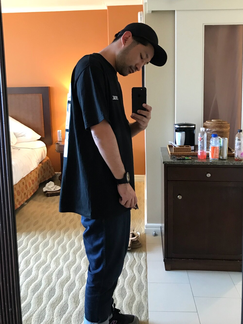 ハワイのヒルトンホテルでデカい鏡があったので。この後KICKS HIでスニーカーとTシャツ買いました。
