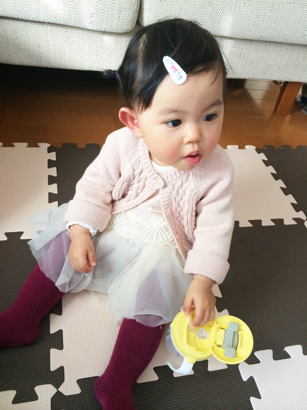 今日はお友達のお家でクリスマスパーティでした♡ その前にお家でパシャリ♡ カーディガン/babygap チュールワンピース/ブランド不明 タイツ/zarababy
