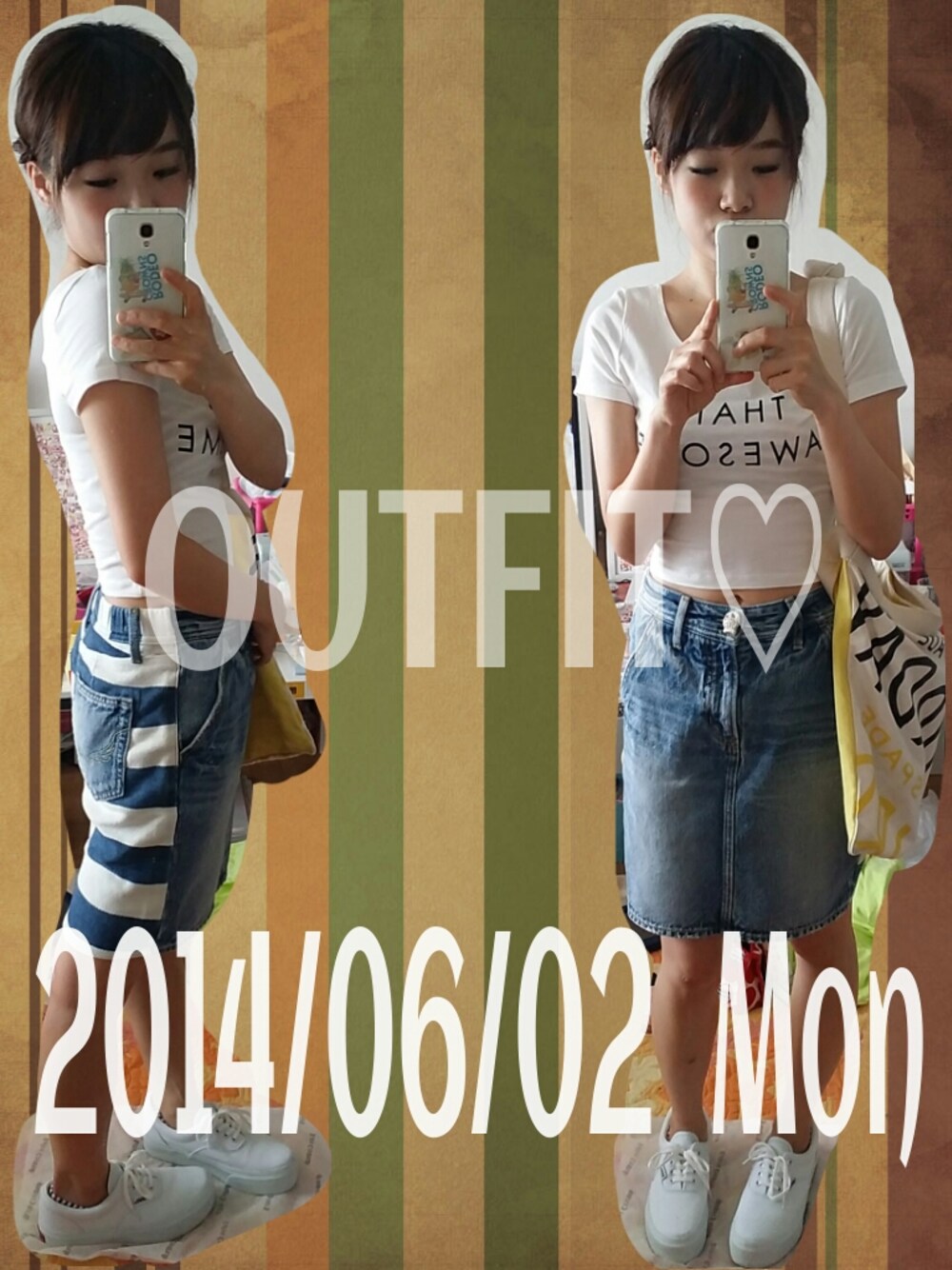 KONATSUKIのデニムスカート「ロデオのスカート(´・ω・`)♡ 裏は大好きなボーダー♡」を使ったコーディネート