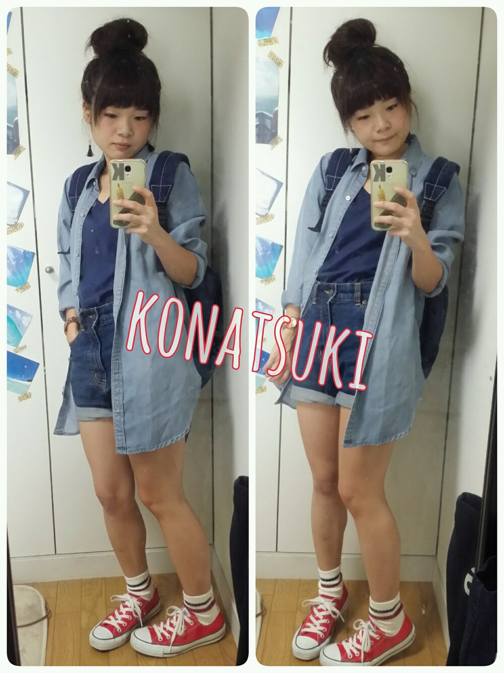 この日も雨☔ もぅ雨飽きちゃったよー。って顔している☺笑しかもまたGAPのシャツ😆✨笑 Tops♡GU DenimShirt♡GAP Bottom♡RonHerman Shoes♡Converse BackPack♡TEMBEA