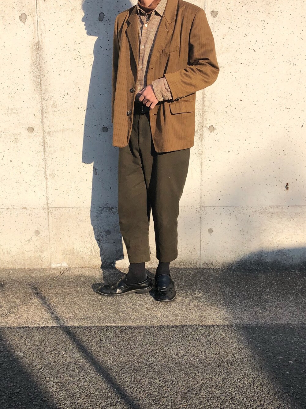 めちゃめちゃお気に入りのコーデ おかんのお下がりジャケット良すぎる... 全体的に茶色で締めました。