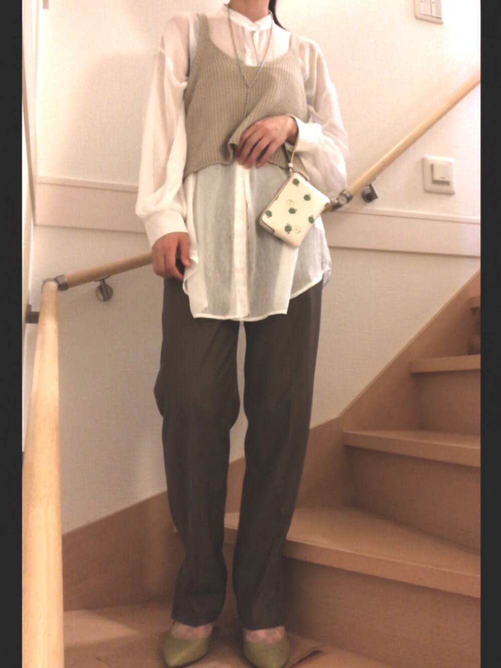 🍏のポーチとグリーンのパンプスがかわいいコーデ!!! スマホやカードしか入らないけど可愛いからオールおっけい!!💮 この上にジャケットを着てもカッコいいかも!!!!😚早く秋よこい!!