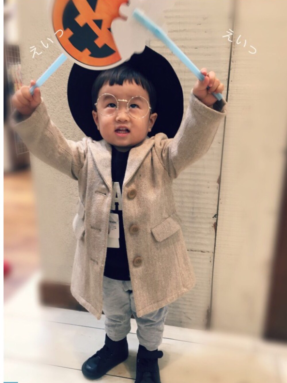 グレーかベージュか、今年ぴったりの90cmか今年は腕まくりで来年もいける100cmかだらだら悩んでいるのはつゆ知らずHalloween🎃🎃フォトプロップスに夢中なゆし君♡ 試着してベージュの90cmに決定!試着暑かったでしょう( ᵕ_ᵕ̩̩ )ごめんねゆし😘最高にcuteよ👌💕