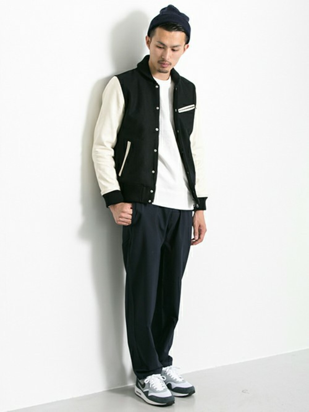 細身のシルエットのスタジャンにカットソーとワイドパンツを合わせたシンプルなスタイリングpart2