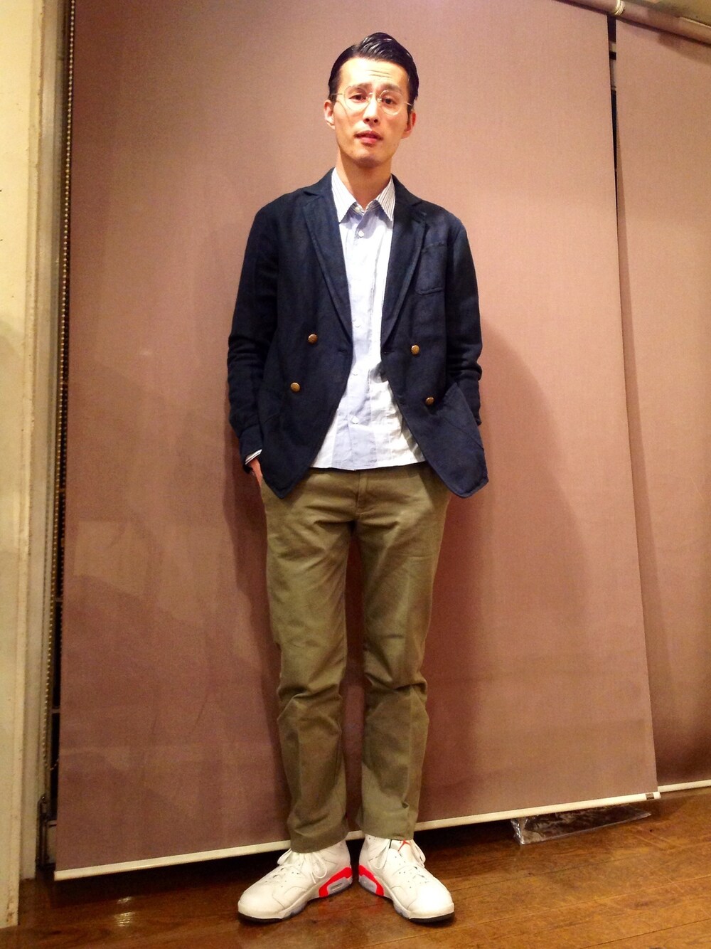 キレイ目と言えば、ジャケットスタイル。 本日はダブルブレストのブレザーをチョイス。 前は基本的に開けて着ます。 ジャケット/ルキーノ シャツ/コムデギャルソンシャツ パンツ/レッドシーム シューズ/エアジョーダン6 メガネ/アヤメ