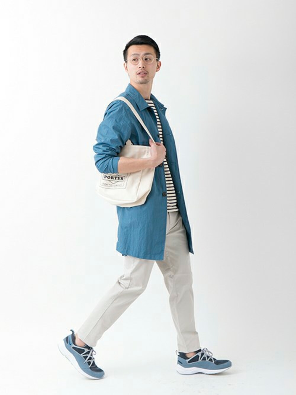きれいなブルーを基調としたスポーツミックススタイル。 大胆にロゴをあしらったキャンバス地のバッグもきわだっています。