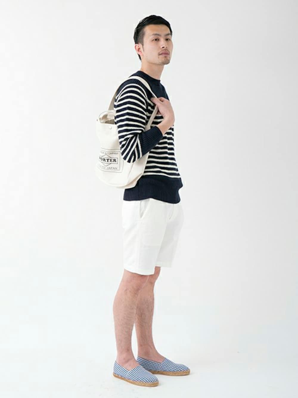 ショーツとエスパと合わせて、初夏のニットスタイル。清潔感はキープしたいです。