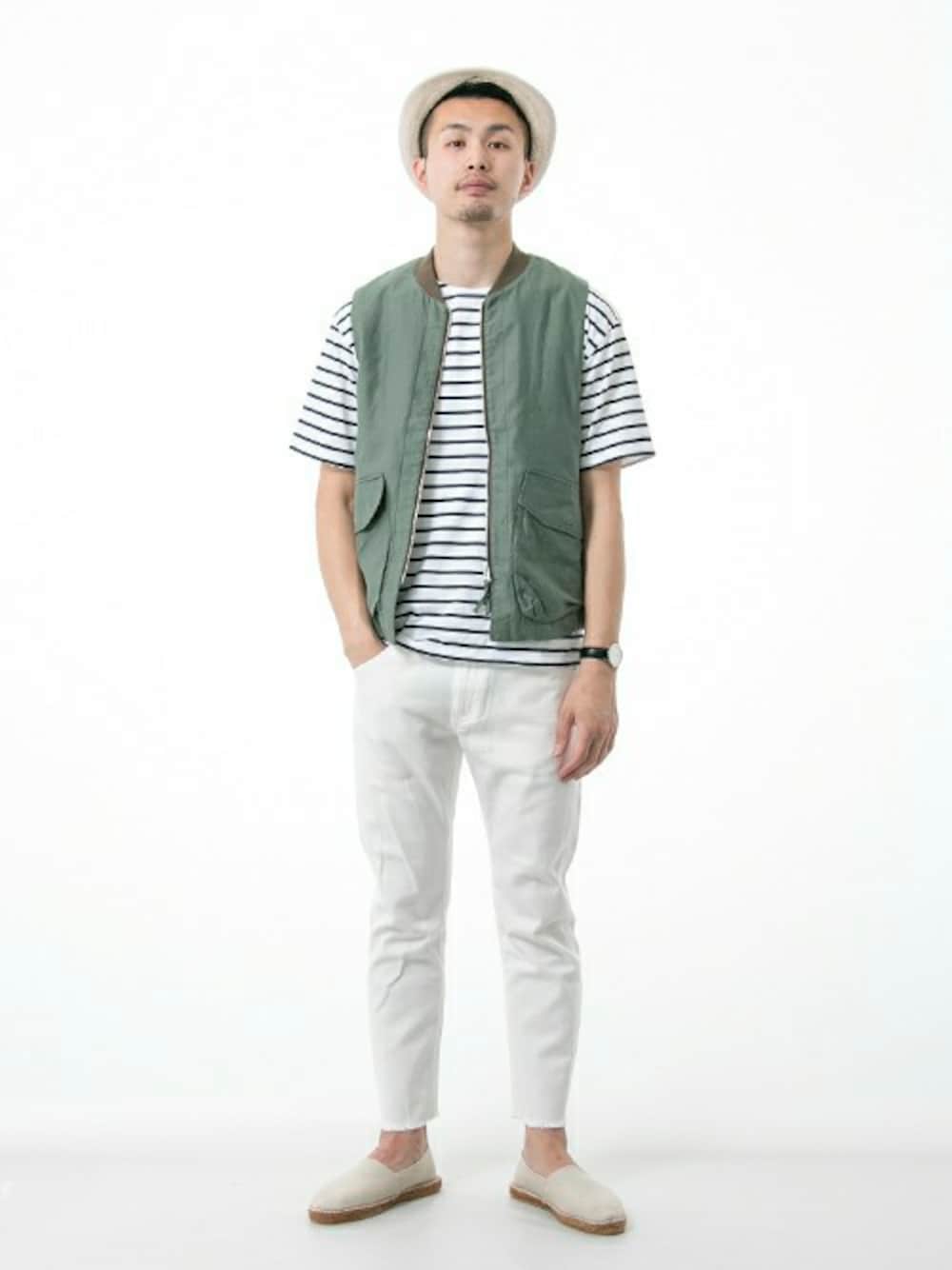 ミリタリーテイストのベストにはあえてフレンチでクリーンなアイテムを合わせて。
