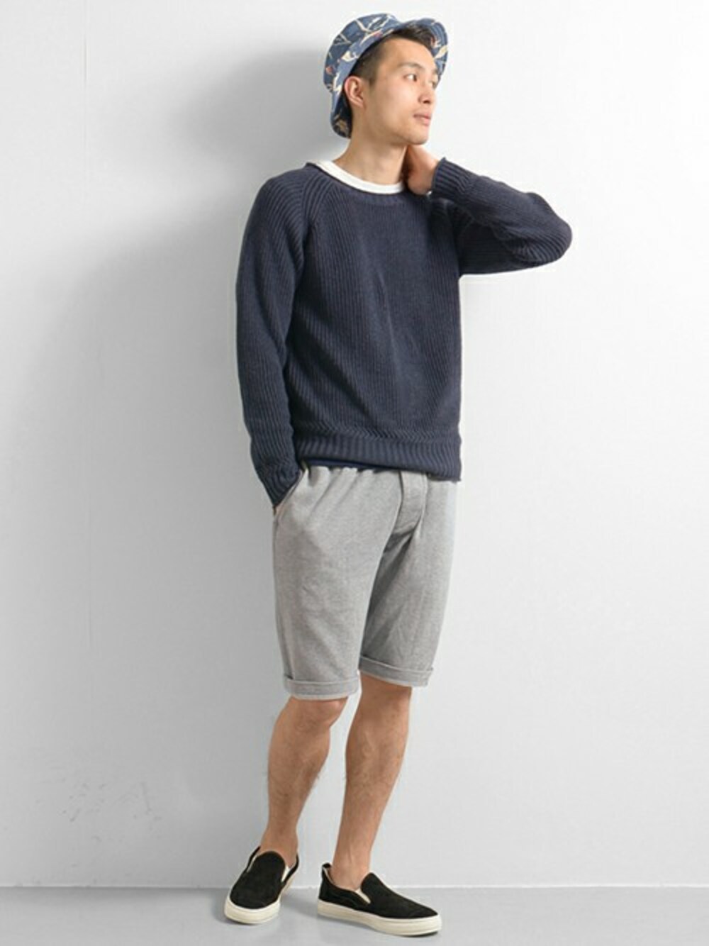 半袖スウェットとの合わせとして、別注のスウェットショートパンツもご用意しました。 シルエット、生地等細部まで拘り、後ろ右ポケットにはMHL.のロゴをプリントしています。 丈が膝下なのでロールアップして軽快に合わせられます。