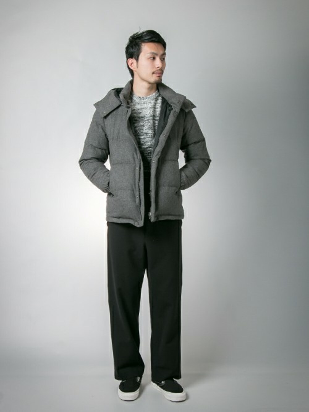 ウールのダウンとワイドスラックスでモノトーンスタイル。ダウンもスタイリッシュに着こなしたい