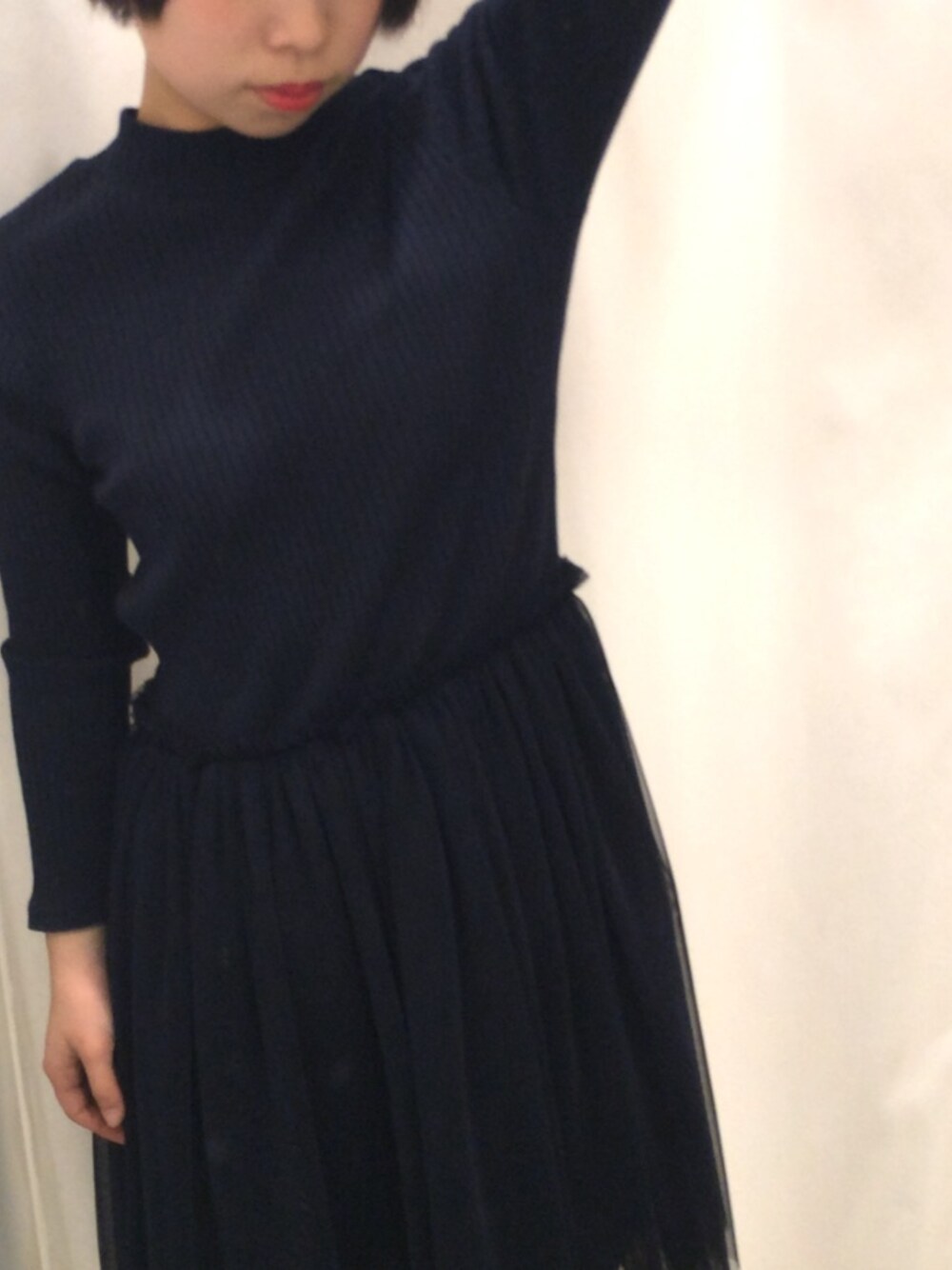 リブのハイネックとチュールのスカートがくっついているワンピース。赤リップに合わせてシックにしてみました。
