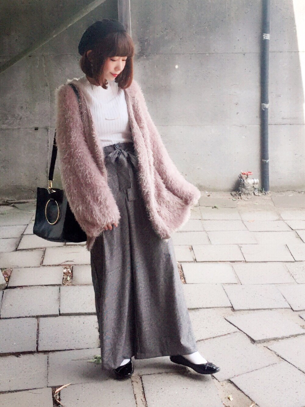 いつものわたしらしい コーデ🙆💕笑 パステル系でまとめてみました! もこもこカーデ × guグレンチェックワイドパンツ いつもいいねありがとうございます🐰❣️