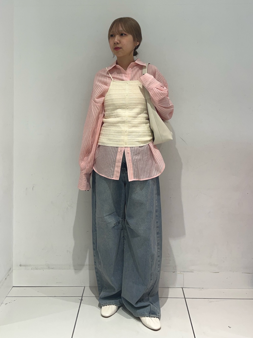 だいぶ暖かい日も多くなって春が近づいて来たのでピンクを使ったコーデ🌸 シアーシャツはほどよい透け感でウエスト部分にボタンが付いているのでダボッと感を抑えてくれます✨️