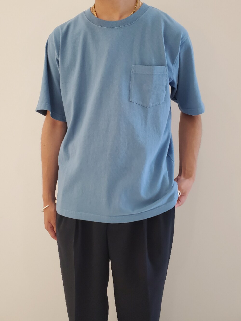 【清潔感のあるブルーコーデ】 フルーツオブザルームの別注Tはガーメント染めで雰囲気◎