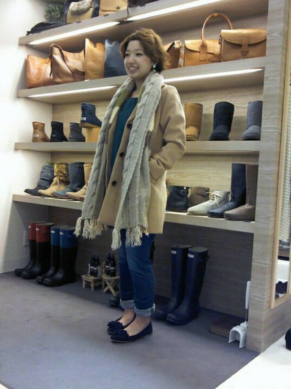 大きめのジャケットコートで 少し女性らしく、 足元は流行りのフラットシューズで着ました。