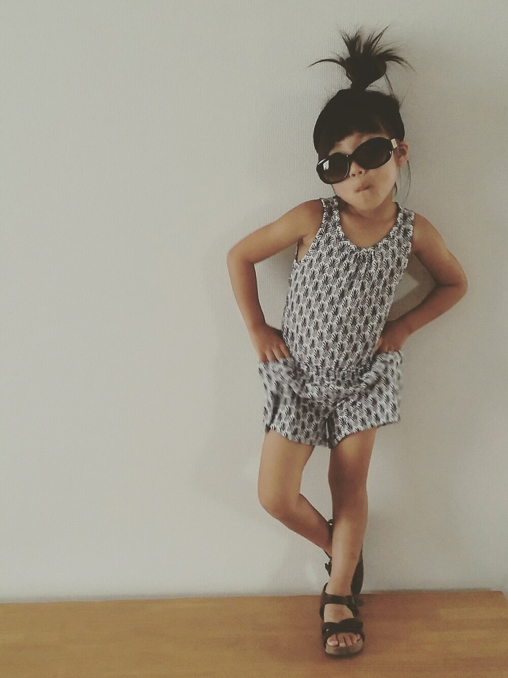 ホワイト系のオールインワン・サロペットを着用したキッズの夏コーディネートの1枚目の写真