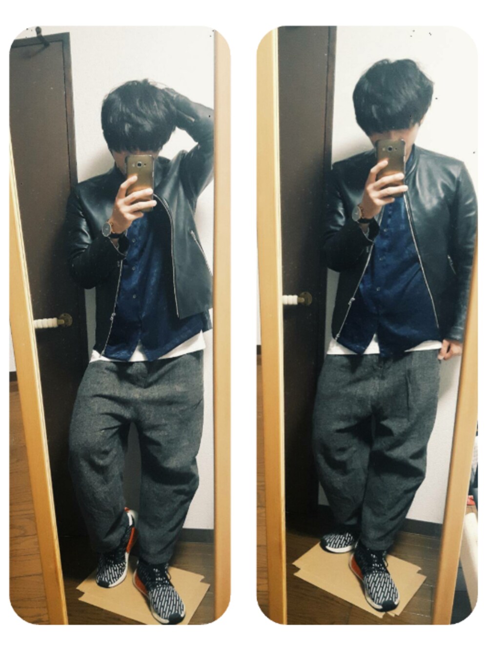 ご覧頂き、ありがとうございます! 以前あげたネイビーのオープンカラーシャツにライダースを合わせたコーデです。 印象がより男性的になったのでポーズもちょっと悪い感じにしました。 インスタ:y.a.y.a.fashion いいね、フォロー、saveもありがとうございます♪