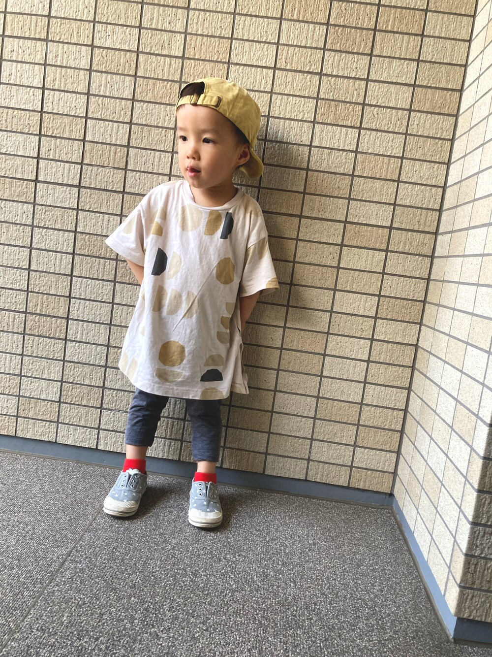 kontsuのTシャツ/カットソー「ロング丈Tシャツ マルトハンブンコ(90~130cm)」を使ったコーディネート
