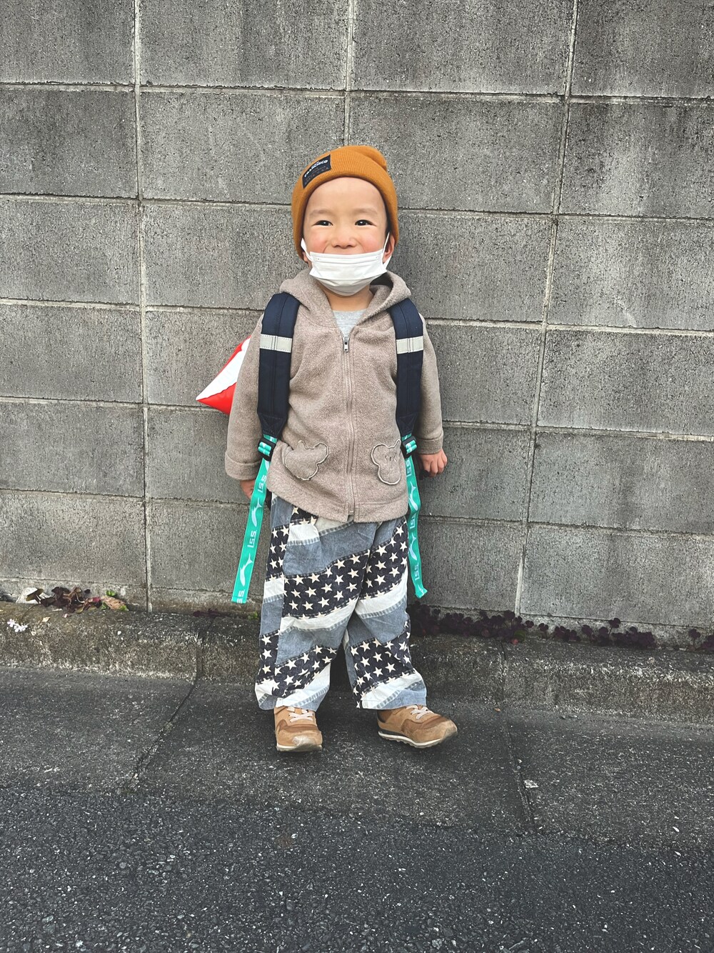ブルー系のパンツ、イエロー系のスニーカー、オレンジ系のニットキャップ/ビーニーを着用したキッズの冬コーディネートの1枚目の写真