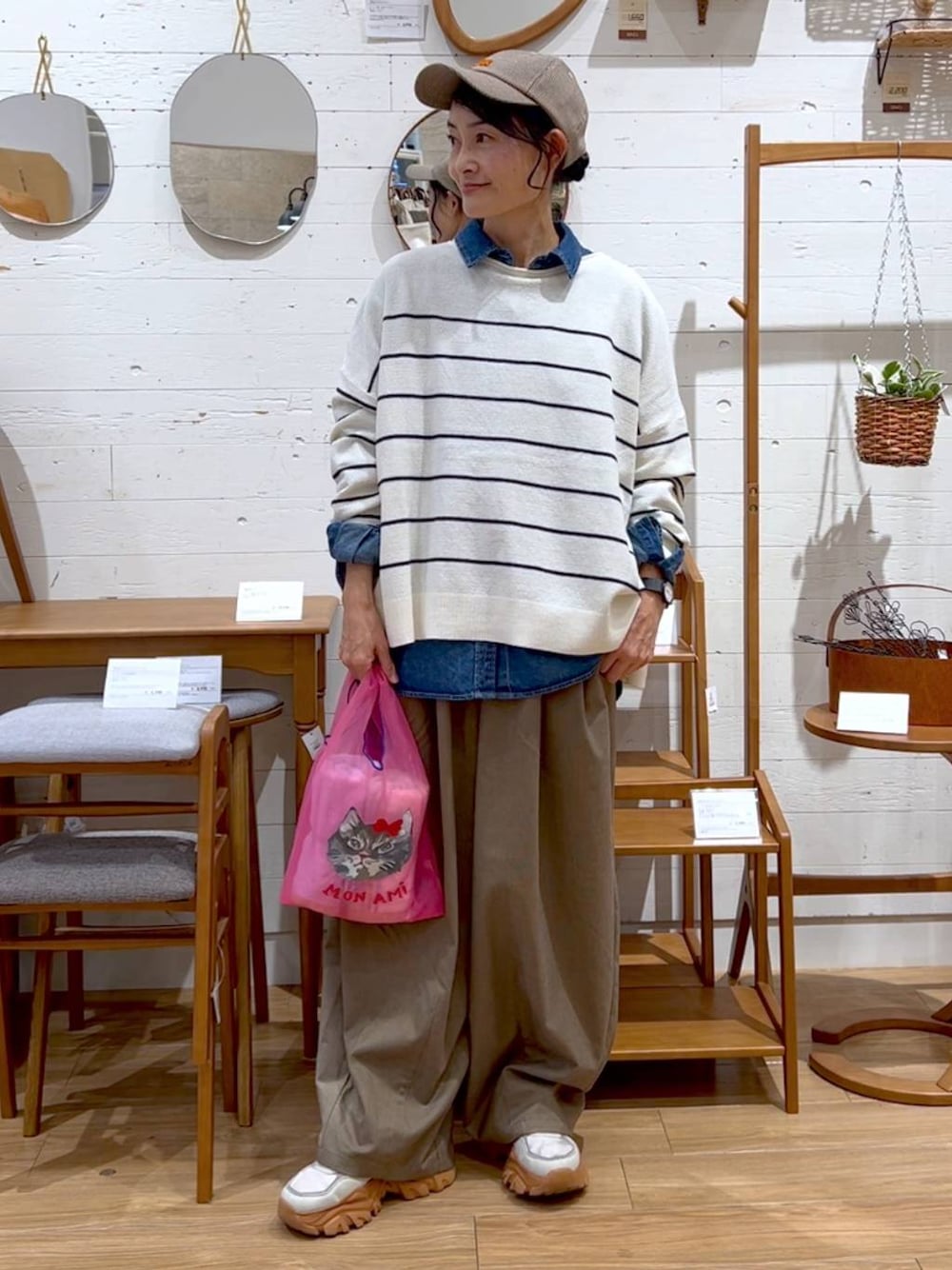 ご覧頂き ありがとうございます! 大人気のクリップデニム。 サイズで長さが選べるデニムシャツ。 インナーで すっきりお召し頂くには レギュラーがおすすめです◎ ニットを重ねても とてもかわいかったですよ! かわいいネコさんのエコバッグ中には タオルを入れています!