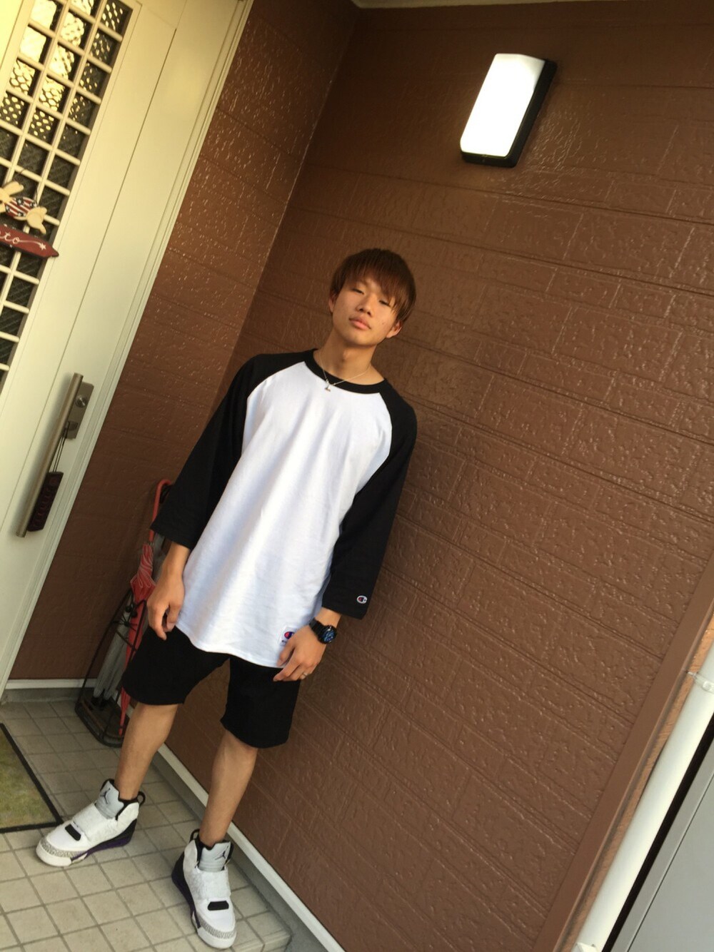 友達に譲ってもらったエアジョーダンのスニーカーを着用しました\(^o^)/ 上はチャンピオンのベースボールTシャツです!!