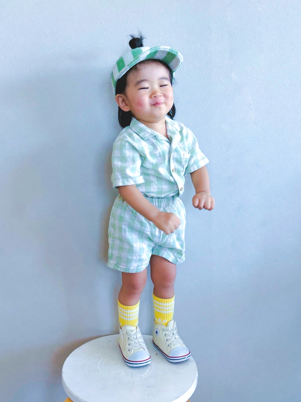ダンスダンス〜🎵 最近よく踊ってます。 ギンガムチェックのシャツにショートパンツのセットアップ!サイズがぴったりになって今が1番かわいく着られるね🤗