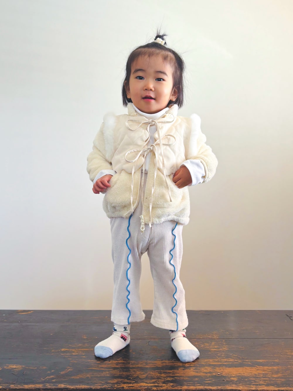 白とアイボリーのホワイトコーデ フリースの上からキルティングベストのレイヤードでデイリー使いのフリースを新鮮な着こなしに。