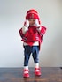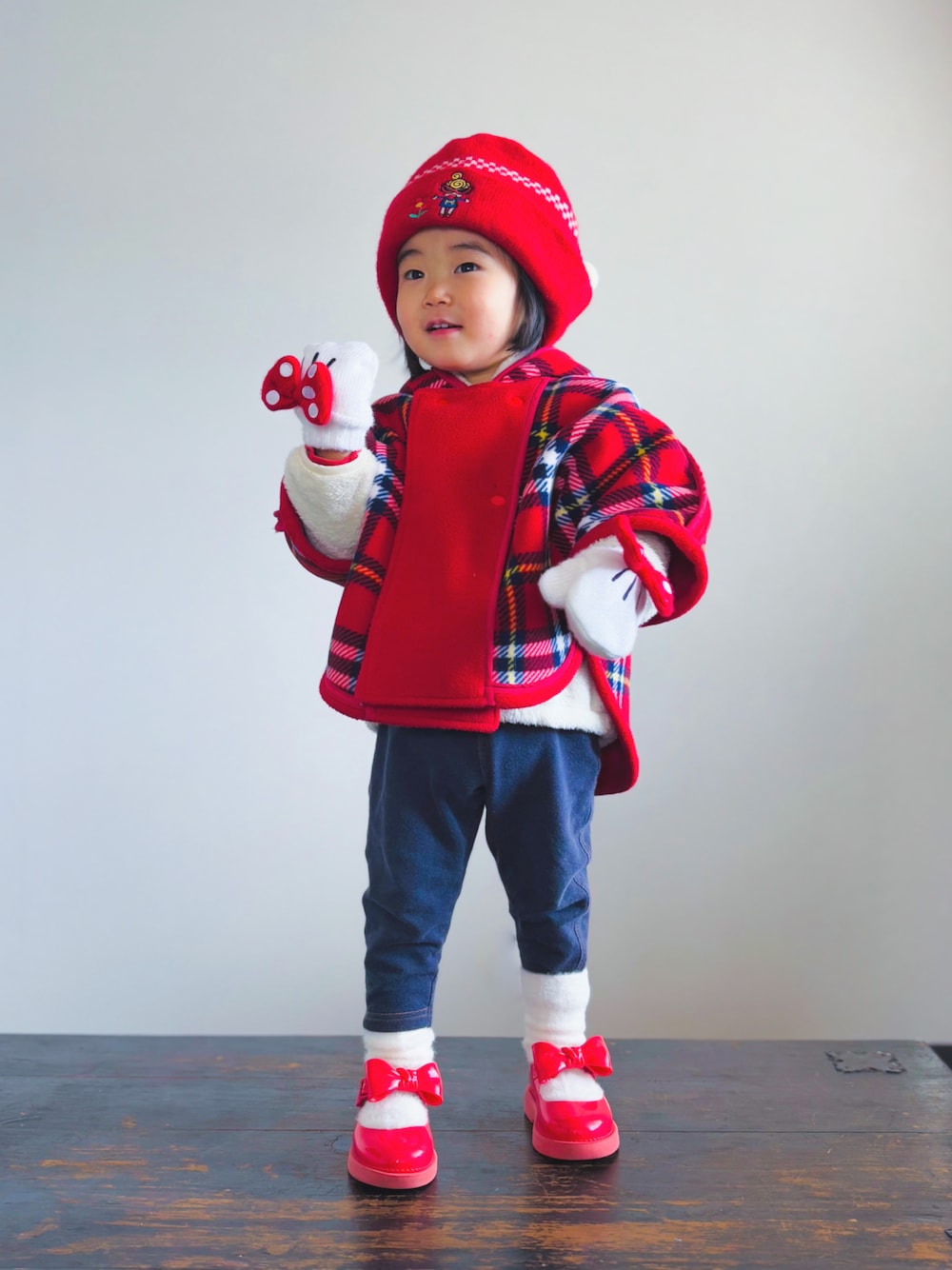 フリースの上にポンチョのレイヤード。 手袋にふわふわ靴下、これで雪が降っても寒くない!👌 ポンチョはインサイドアウトで裏のチェックをメインにしました。 ガーリー一直線ですがボトムにスカートを合わせないのがKOOO流です👍
