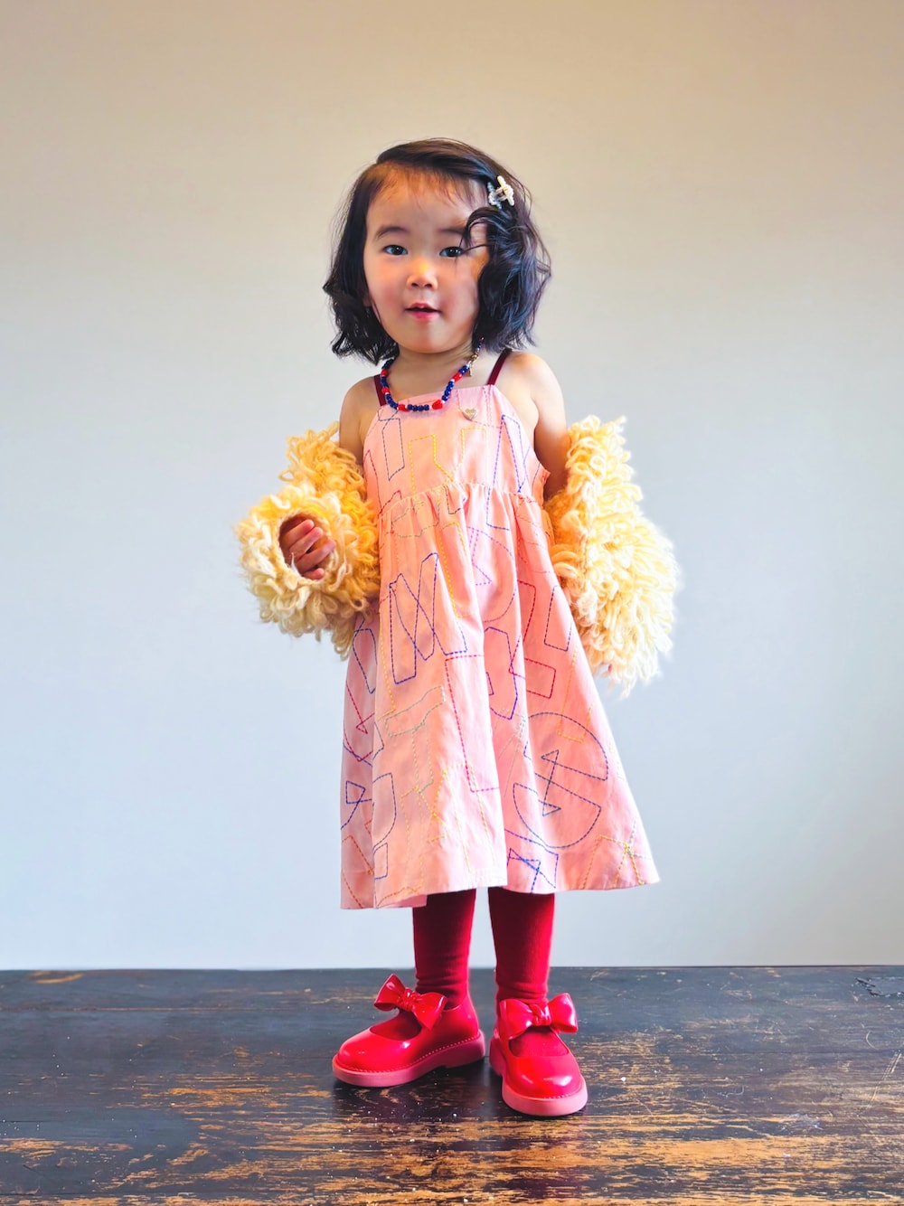 この時期にあえてレイヤードをせず着るキャミワンピ。ふわふわのアウターを羽織ればキッズのマリリンモンロースタイルの出来上がりです♡