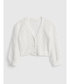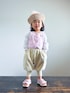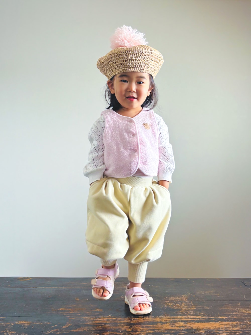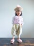 シースルー カーディガンに短丈ベストのレイヤード。 全体的に淡いピンクで統一して爽やかに。