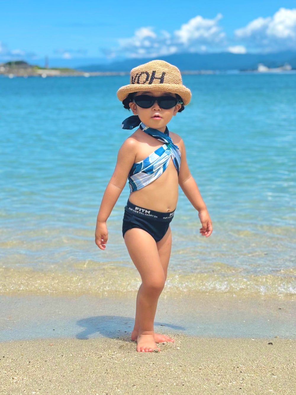 今日の水着は母の弟が着用していたもの🩲 既にヴィンテージアイテムとなったFITHのスイムパンツ🩲今でも余裕で使えます! トップはスカーフを水着アレンジ!
