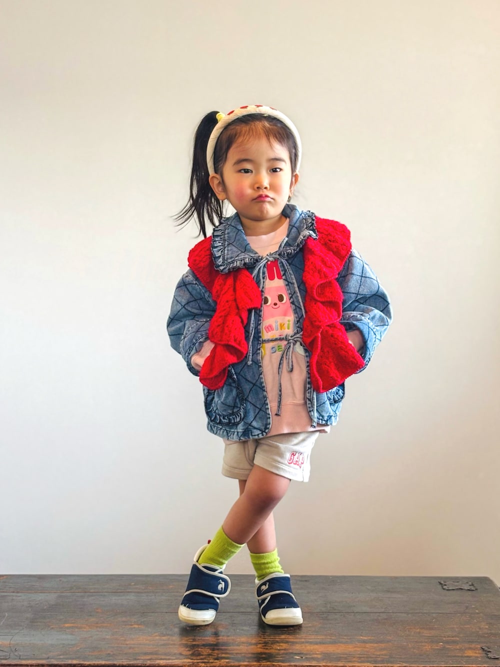 デニムにスウェット❤️ マフラーを使ってまだ冬も意識してみました。 生意気な表情ができるようになったなあ。