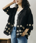 現在も大好評頂いている手編みニットの半袖バージョンが登場。 存在感のあるシャツ型デザインと雰囲気を持ったクロシェ(カギ編み)素材が特徴です。 ニットカーディガンなどはよく見かけるデザインですが、今回はオープンカラーシャツの形で可愛らしいカギ編みしました。 サイズ感は、可愛らしくなりすぎないよう男らしい短丈のシルエットデザインでコーディネートを楽しめるよう仕上げました。 花柄を部分使いし、色も2色使いとよりシンプルで使いやすく、飽きのこないカラーリングです。 男性でも女性でもコーディネートに取り入れられる、個性の光るニットアイテムです。 身長:170 体型:標準(やや肩幅広め) 普段サイズ:M〜L 着用サイズ:M サイズ感:身幅ゆったりで丈感スッキリ! 着心地:とても柔らかい質感で軽い! レイヤードもしやすく、コーデの主役になること間違いなし!! 少しでも参考になりましたら、フォローしていただけると嬉しいです。