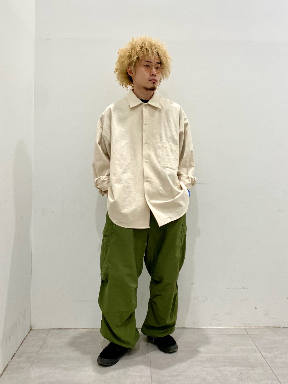 【ARMY TWILL × relume】 -special collection- 前回大好評だったミリタリーシャツが新色を追加して登場! relume別注で90年代アメリカのミリタリーシャツを彷彿させるディティールを現代のシルエットに再構築したシャツを作成。 インラインより1サイズダウンした少しスマートなシルエットになります。 素材はヴィンテージのスリーピングシャツをベースに作っており、スラブ感とネップ感があり生地自体に表情のあるヴィンテージらしい生地感になっています。 ミリタリーシャツのビッグシルエットは一枚着でも羽織としても活躍すること間違いなし! オーバーサイズにはワイドパンツでメンズライクなコーデにまとめました。 身長:170 体型:標準(やや肩幅広め) 普段サイズ:M〜L 着用サイズ:シャツ M パンツ M サイズ感:身幅だけでなくアームにもボリュームがあり、オーバーサイズ好きには堪らないアイテムです。 着心地:コットンの柔らかい質感とヴィンテージのような生地感で肌あたりも良い!! 少しでも参考になりましたら、フォローしていただけると嬉しいです。