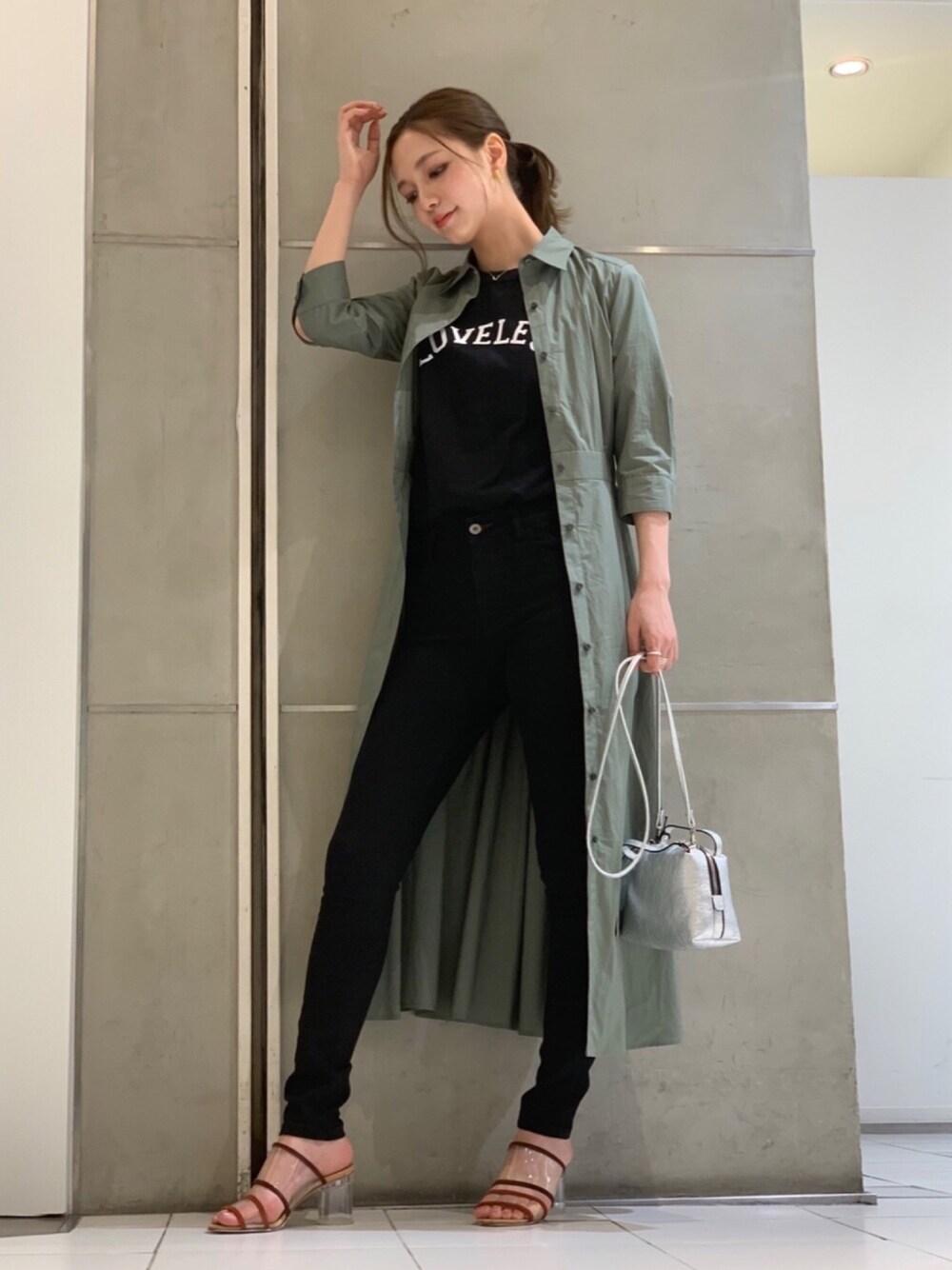 1枚で着ても可愛いシャツワンピースを羽織りとして着用したカジュアルなコーディネートです。