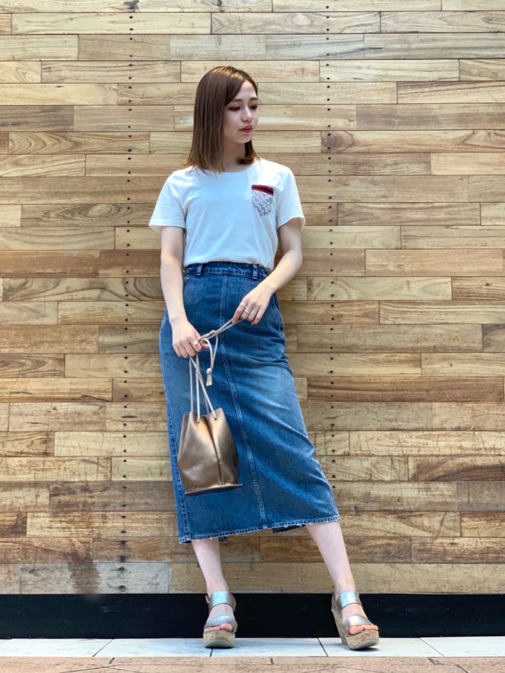 ポケット部分にジオメトリック柄が施されたTシャツ。 デニムスカートと合わせ、夏らしいコーディネートに仕上げました!