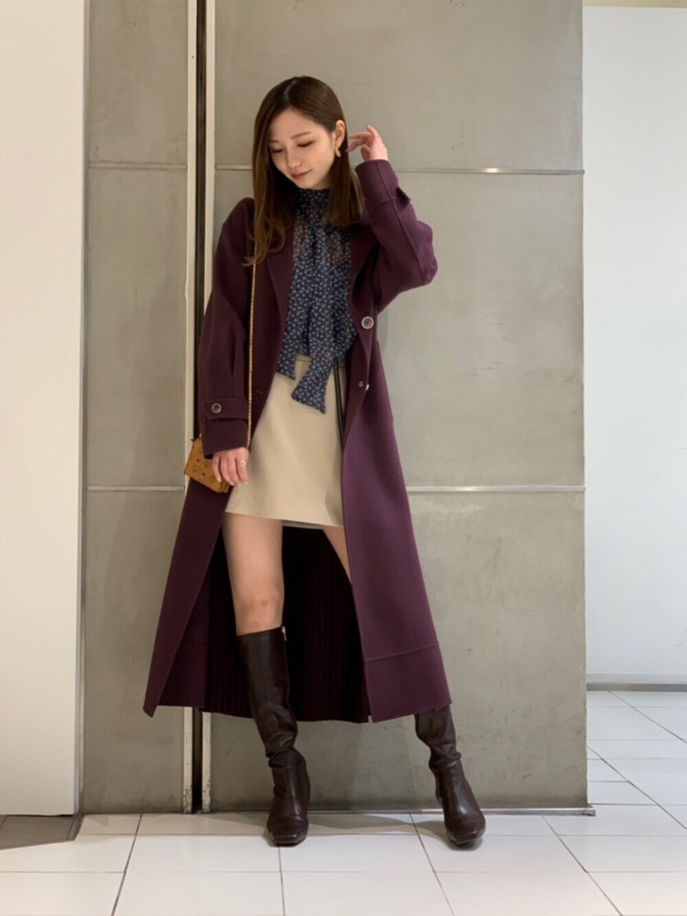 小花柄のボウタイブラウスに台形スカートを合わせたレトロな雰囲気のコーディネートです。
