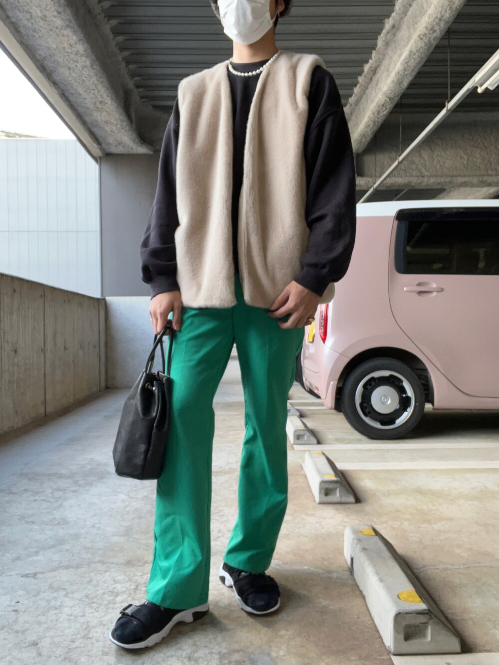 ご覧いただきありがとうございます✊ ちょっと肌寒かったですがファーベストコーデ. グリーンのパンツは合わせるのが難しいです💦